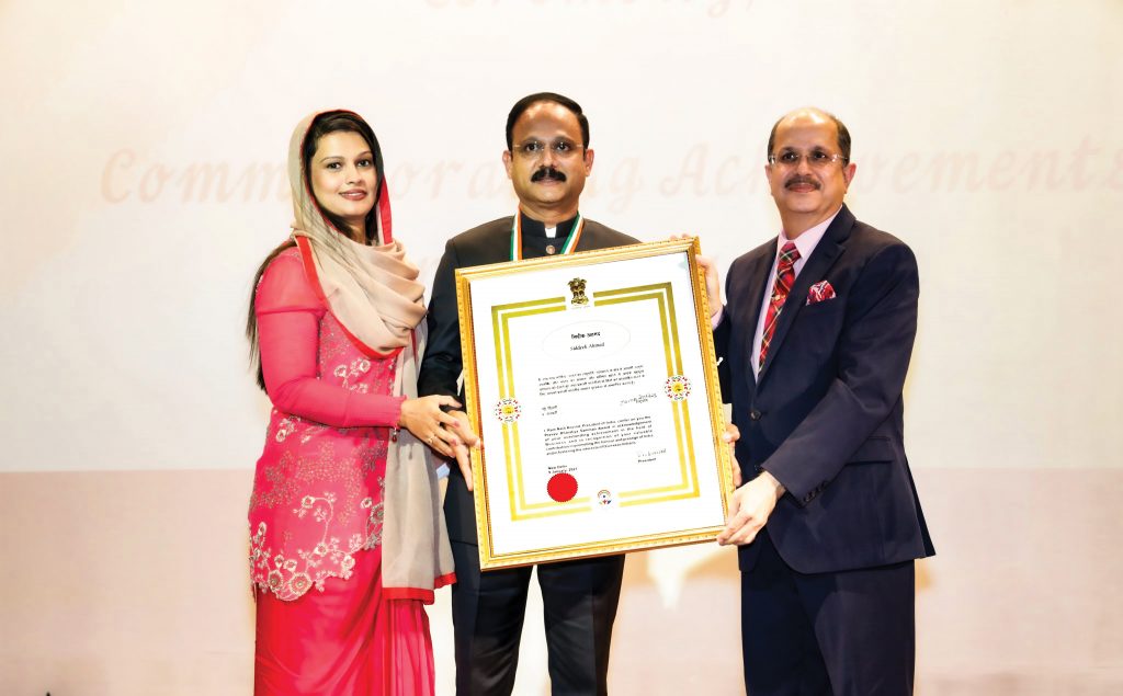 Indian Ambassador Dr. Ausaf Sayeed presents the award to Eram Group Chairman Dr. Siddeek Ahmed (center) in Riyadh. On the left is Dr. Ahmed’s wife Nushaiba.